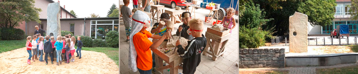 Der Erfahrungsstein versteht sich als eine Ergänzung des bestehenden Ensembles und entstand unter Beteiligung der Anwohner (Kinder, Jugendliche und Erwachsene). An 10 Tagen hatten Kinder und Jugendliche die Möglichkeit, nachmittags für vier Stunden unter qualifizierter Anleitung (Michael Düchting und Dorothee Weber) bildhauerische Techniken zu erlernen und eigene Steinobjekte herzustellen. Darüber hinaus hatten sie die Möglichkeit, den Herstellungsprozess sowie das Aufstellen des Erfahrungssteines mitzuerleben. Nach Abschluss des Projektes wurde der Erfaghrungsstein mit allen Beteiligten feierlich eingeweiht.
